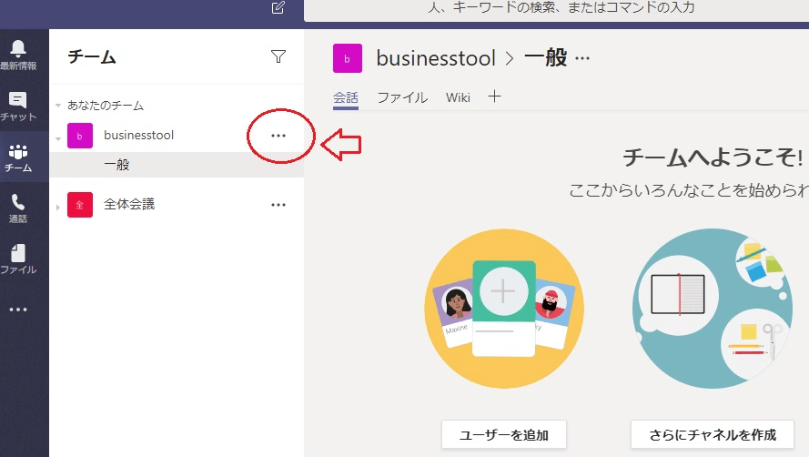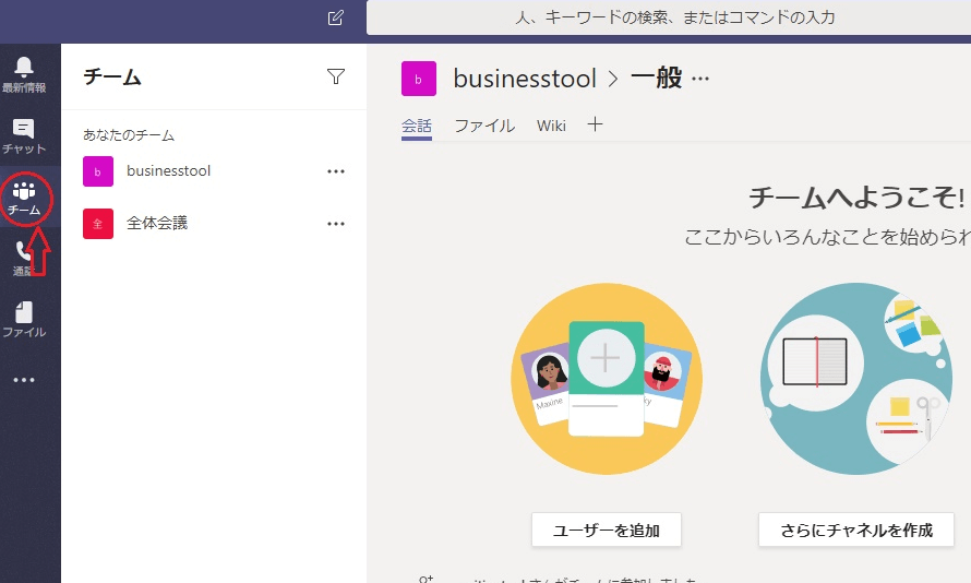 会話のやり方ですが、「チームへようこそ!」の画面の左側に並ぶアイコンから「チャット」を選んでクリックしてください。