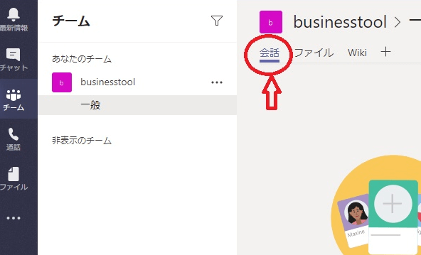 チーム内でその会話を共有したい場合は、事前にメンバー全員に通知しておき、各メンバーが「会話タブ」を開いて内容を確認します。
