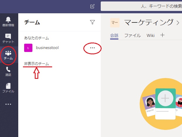その中に「非表示」という項目があるので選択すると、リストから消えて「非表示のチーム」の中に含まれます。