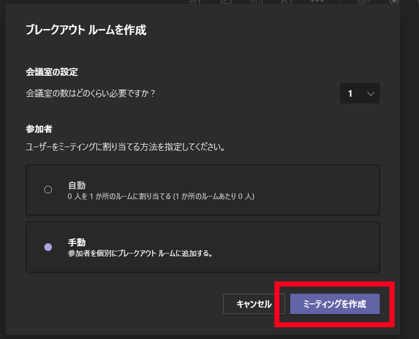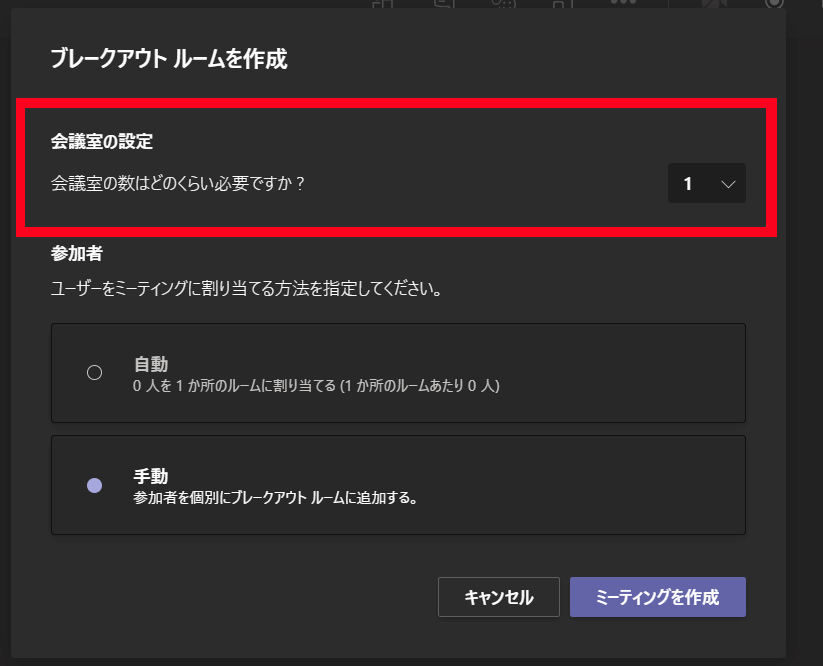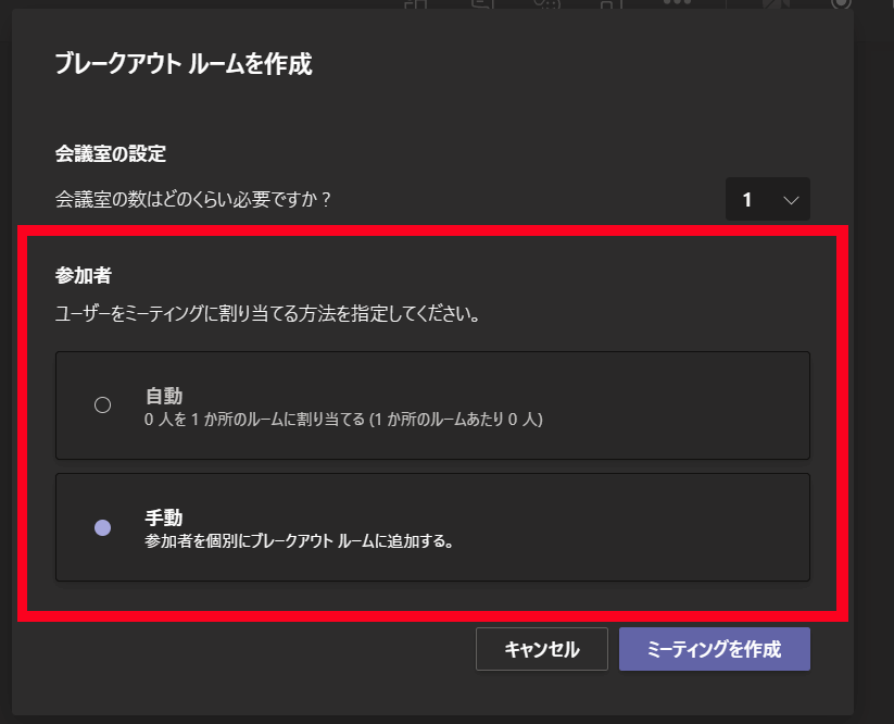 「会議室の設定」で設定したブレークアウトルームにTeamsが自動で割り当てても良い場合は「自動」を選択。
