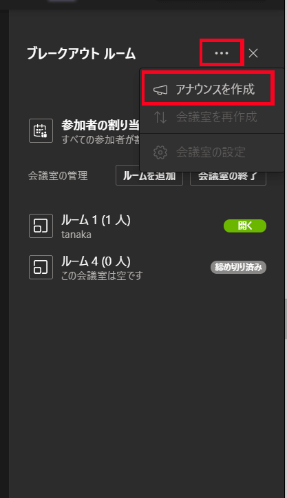 11. 全てのブレークアウトルームに共通のアナウンスを送信したい時は、ブレークアウトルームと表示されている右横の「…」から「アナウンスを作成」を選択。
