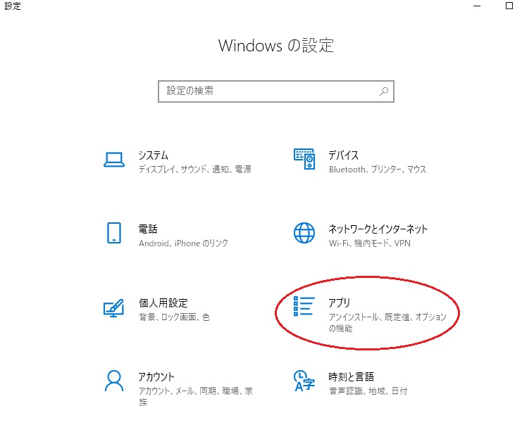 「Windowsの設定」画面が出たら、「アプリ」をクリックします。