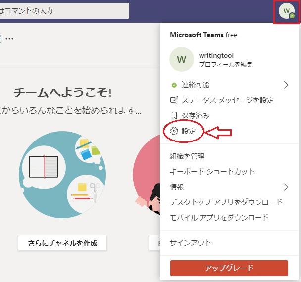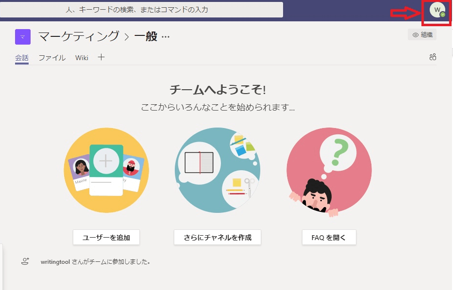 Teamsにサインインしたら、コマンド入力スペースの右にあるアカウントのアイコンをクリックします。