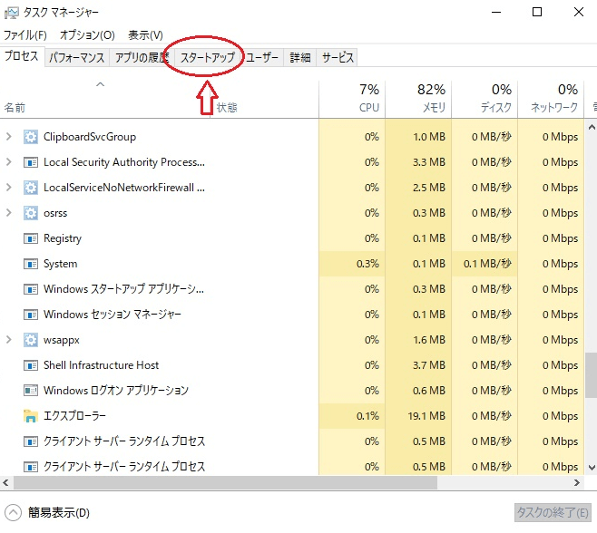 タスクマネージャーが起動したら、上の方に並んでいるタブの中から「スタートアップ」を選択します。