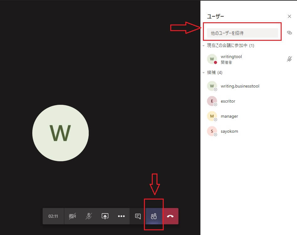 候補の中からメンバーを選んで、一番上にある「他のユーザーを招待」に記入すると会議に参加させることが可能です。