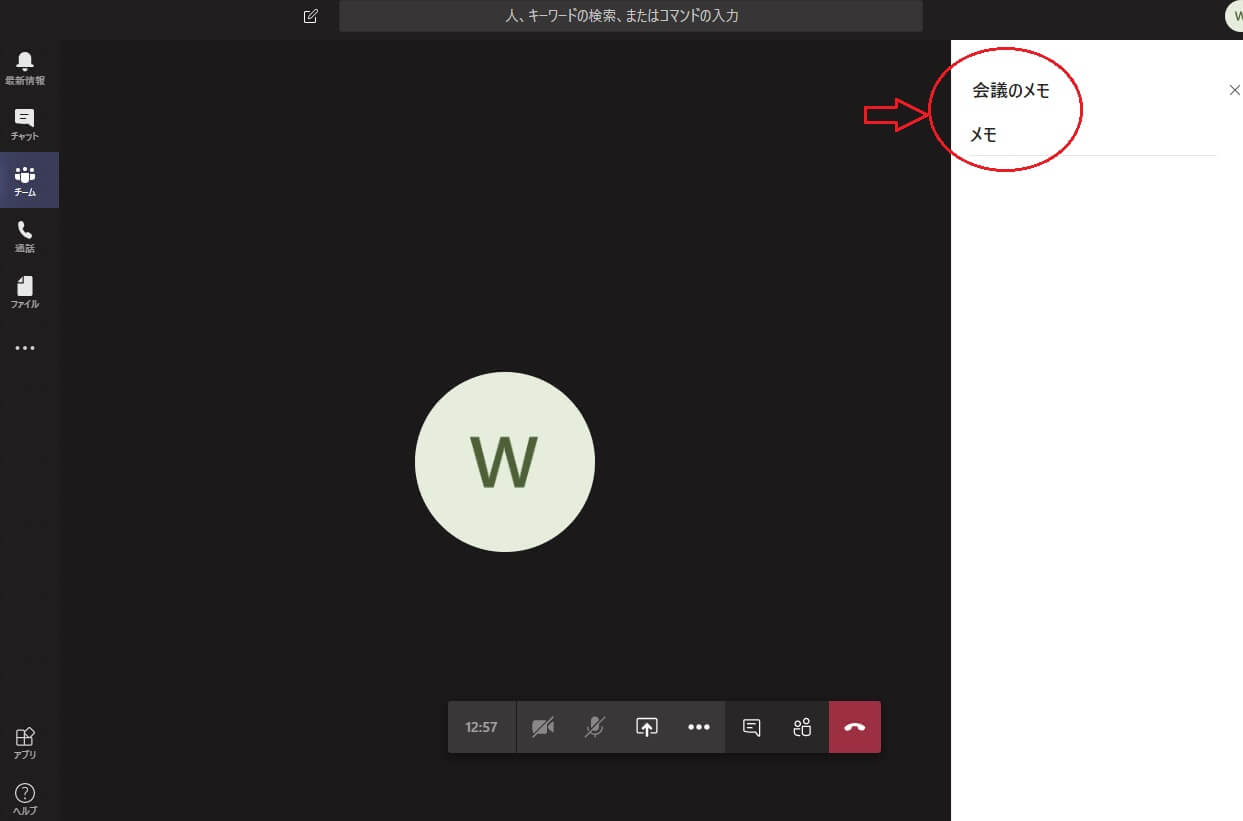 「会議のメモを表示する」を選ぶと、右サイドに会議のメモ欄が表れます。そうしたらメモ欄の下部にある「メモを取る」をクリック。
