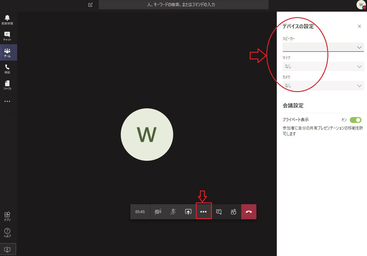また「デバイスの設定を表示する」を選択すると、スピーカー、マイク、カメラの設定画面が右サイドに表示。事前にセッティングしておくと、スムーズに会議の録画ができます。