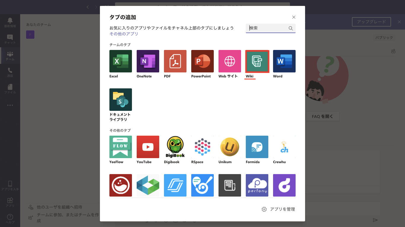 「Your Apps」ページの検索欄に「Wiki」と入力し検索しましょう。