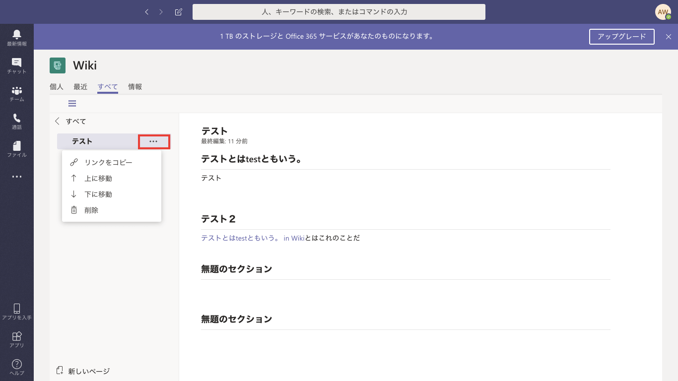 Teams内にある他のWikiページへのリンクを張るには、既存のセクションの右にある「・・・」から「リンクをコピー」を選択します。
