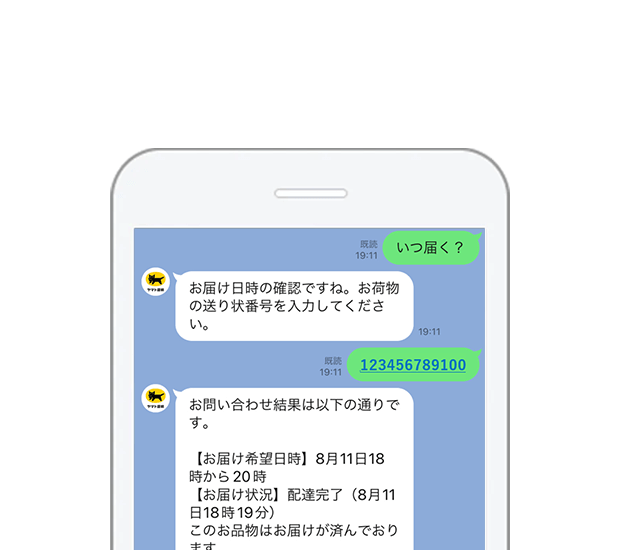 ヤマト運輸のLINE公式アカウントでは、ボットの自動対応で簡単に荷物情報の確認ができる仕組みとなっています。公式アカウントを友だち登録するだけで、チャットから配達状況の確認ができます。