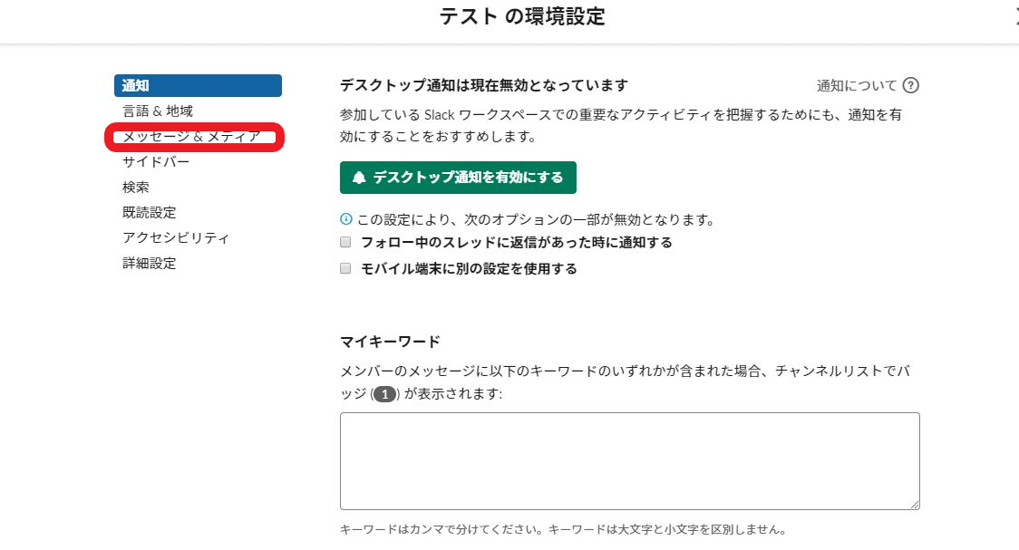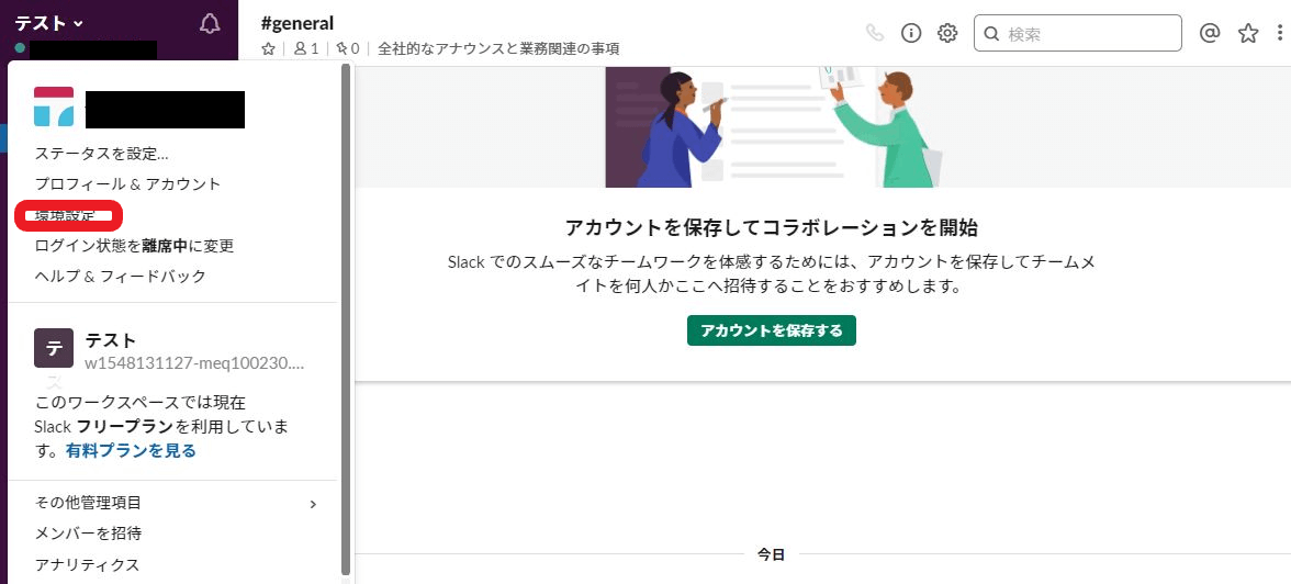Slack上の左上にあるワークスペース名(テスト)をクリックすると、メニュー画面が表示されるので、環境設定をクリックします。