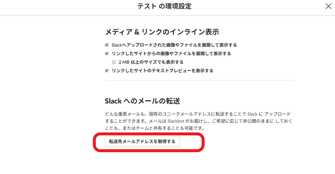 最下部に「Slackへのメールの転送」について表記があるので、「転送先メールアドレスを取得する」をクリックします。