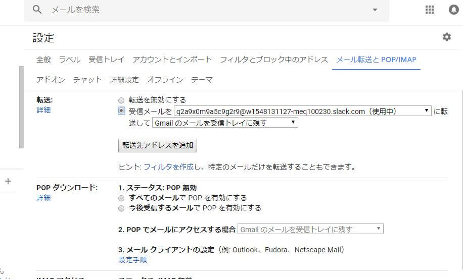 そこから「メール転送とPOP/IMAP」→「転送先アドレスを追加」の順にクリックしていきます。