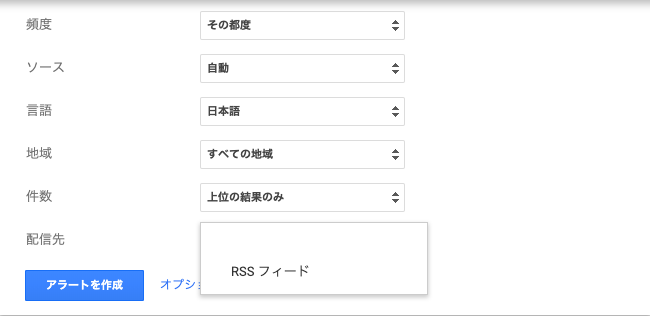 その後、Googleアラートの通知をRSSフィードに通知するように設定をします。