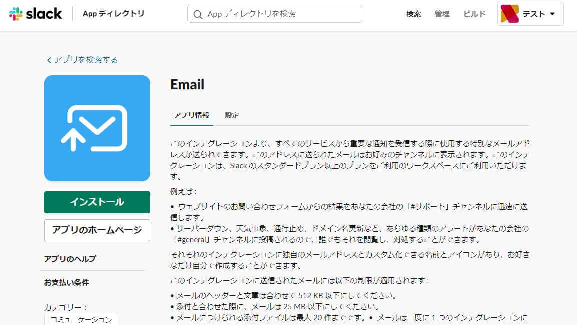 SlackでGmailを受け取るには、Slackのアプリ検索でEmailを選択してインストールします。