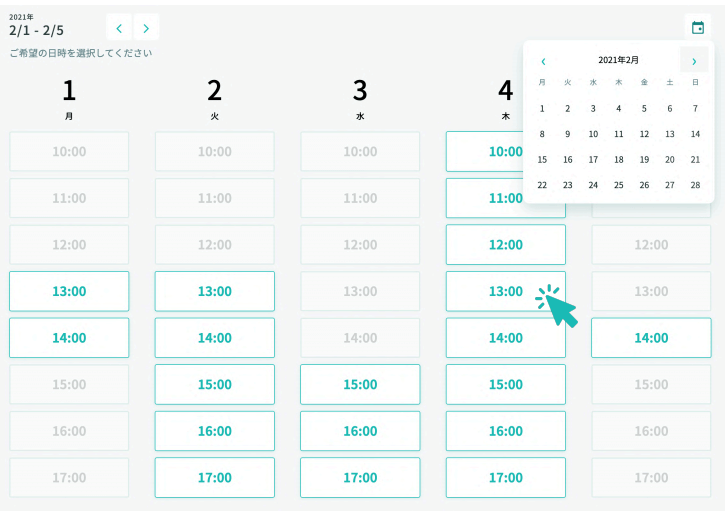 まず、お客様に空いている時間から都合のよい枠を選択してもらえるようにします。