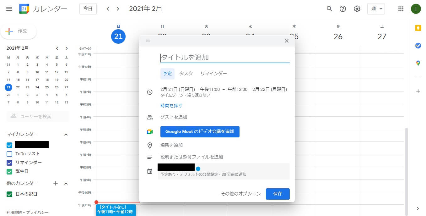 ビデオ会議を行う予定がある場合は「GoogleMeetのビデオ会議を追加」から設定します。