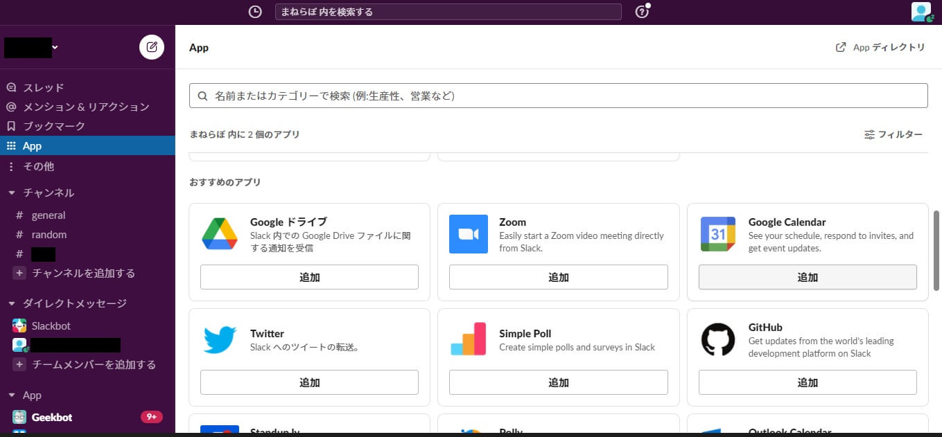 Googleカレンダーの追加方法は、SlackのAppから追加するだけです。追加できるアプリ情報が一覧になっているので、そこからGoogleカレンダーを選択しましょう。