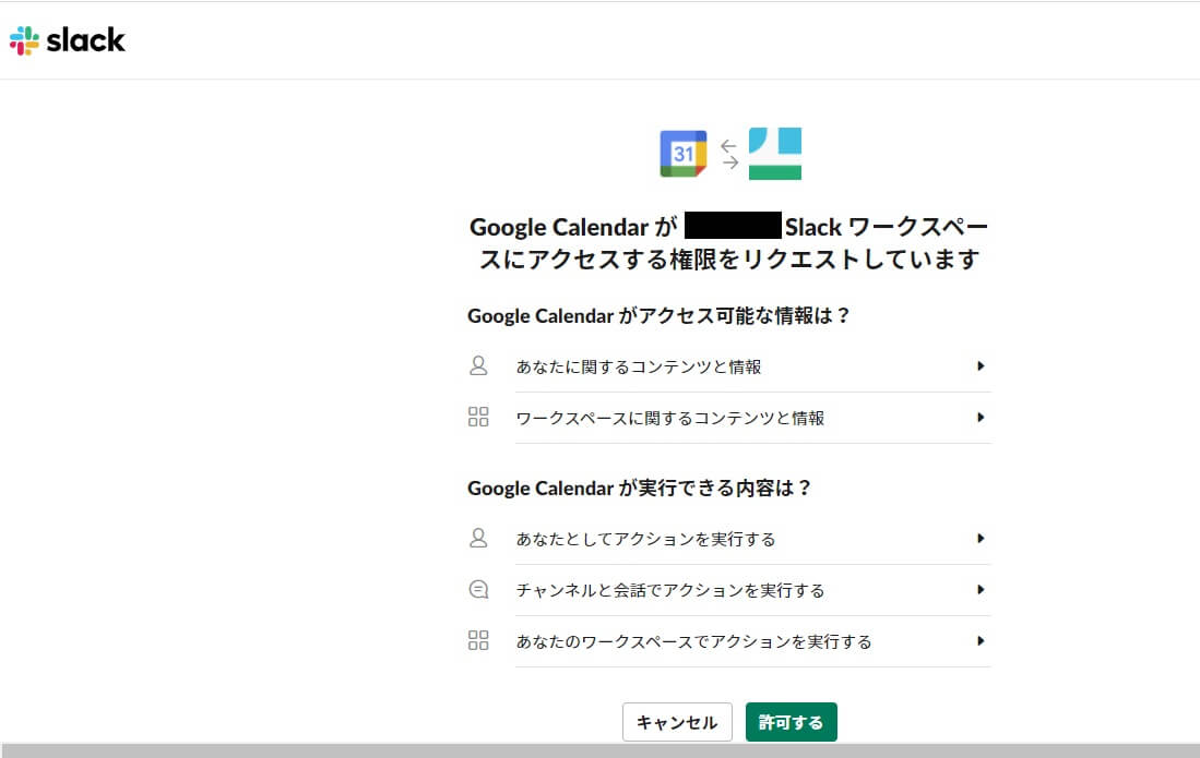 アプリを追加した後の画面で権限を許可すれば、SlackとGoogleカレンダーが連携されます。