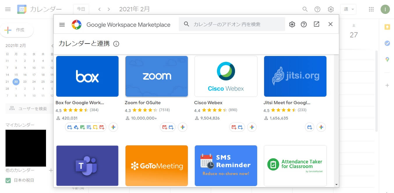 Googleカレンダーの設定から、アドオンの追加を選びましょう。その中にZoomがあるので、インストールすれば連携完了です。
