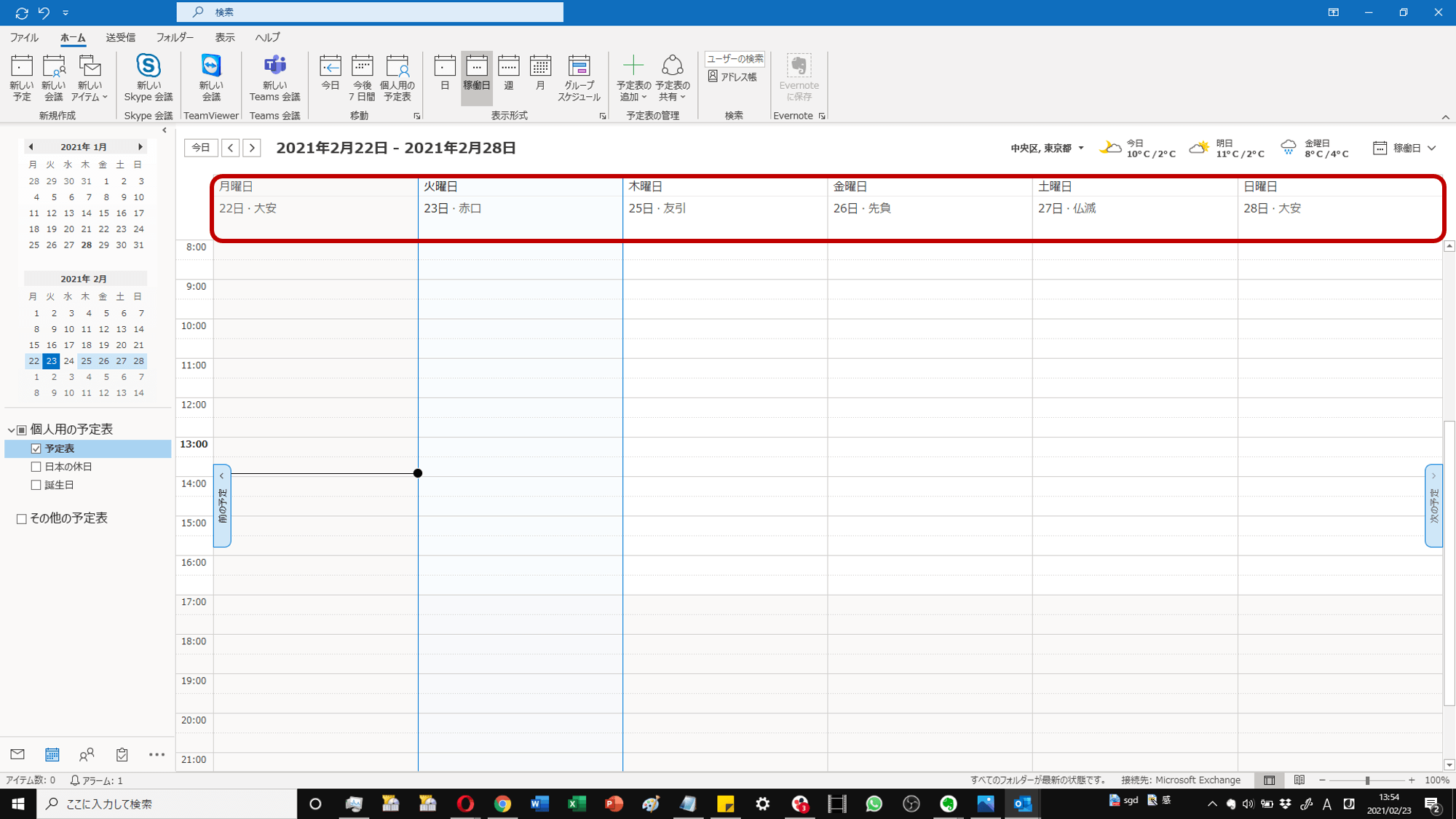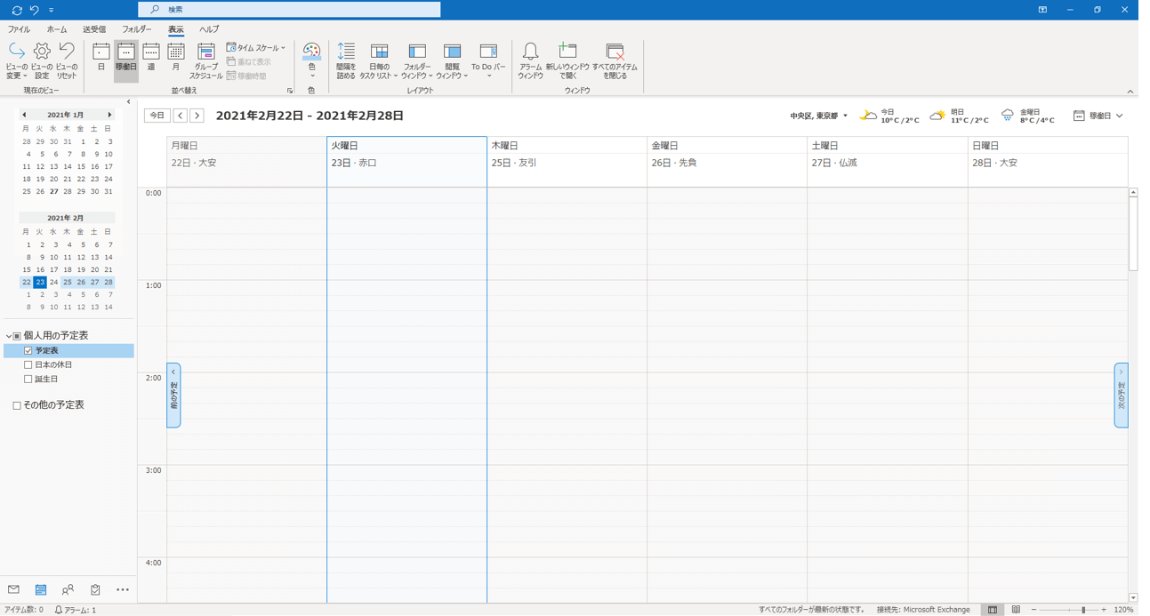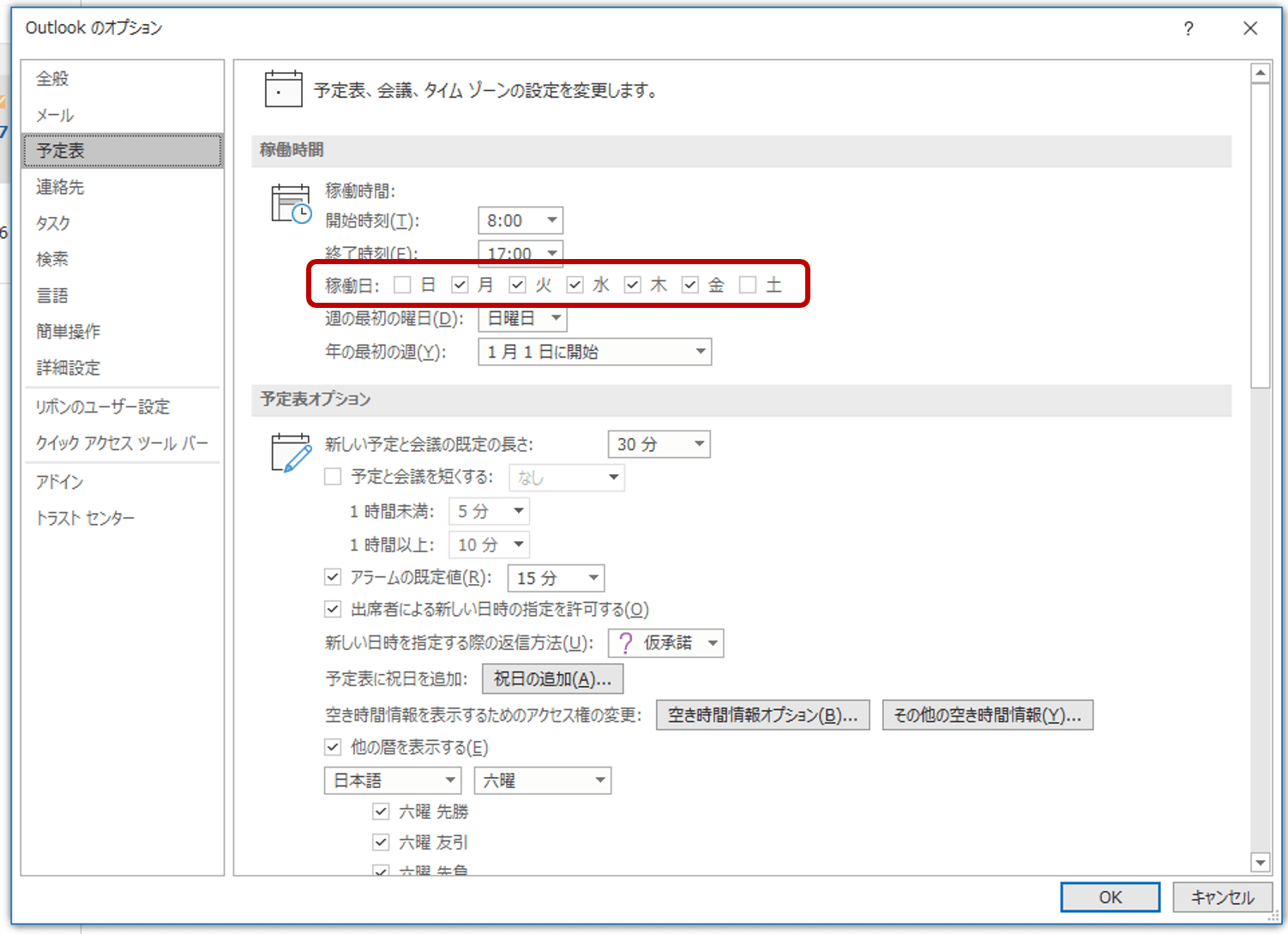 一般的には、月曜日から金曜日までが稼働日であることが多いので、Outlook予定表でもデフォルトの設定として、月曜日から金曜日が稼働日となっています。