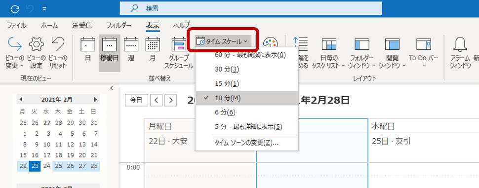 たとえば、10分を選択した場合なら、1時間の枠内に6つの小さな枠が仕切られていて、より細かく時間を活用できるようになります。