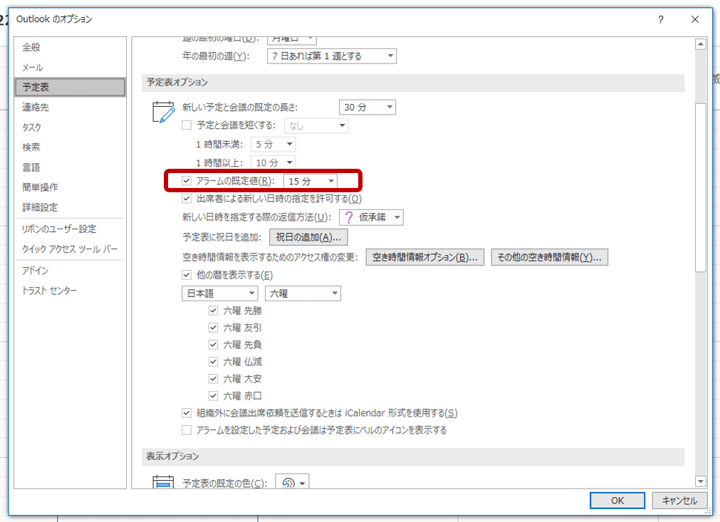 そうしたら「予定表オプション」内の「アラームの規定値」を変更して、アラートを受け取りたいタイミングに調整します。