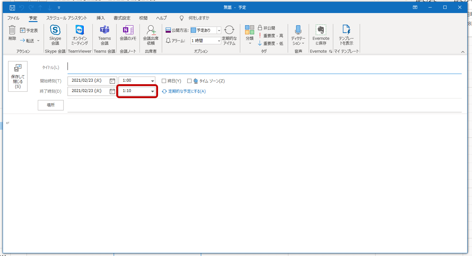 Outlook予定表は、カレンダー内をダブルクリックして新しいスケジュールを入力する形式です。