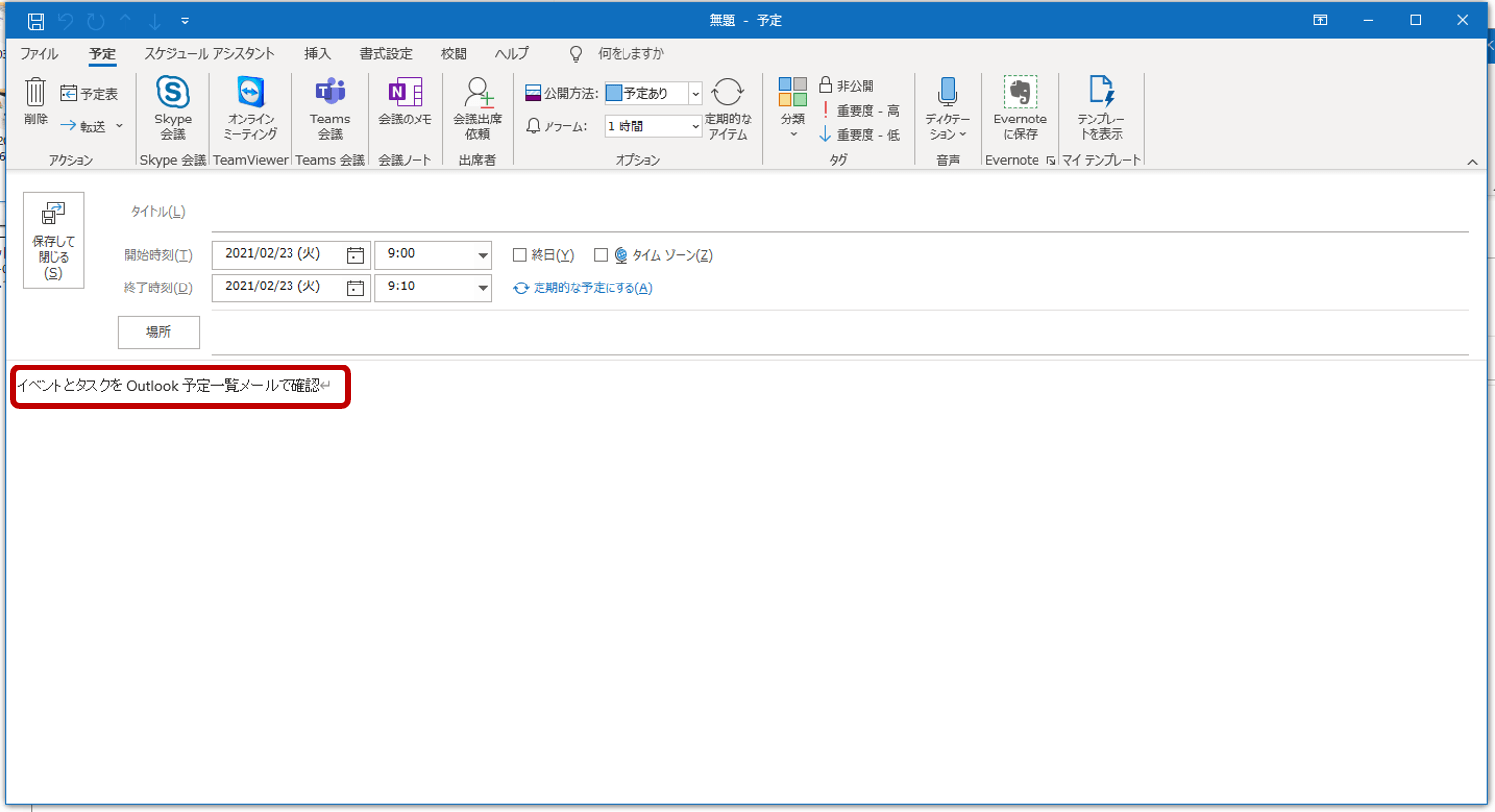 あとは「CTRL」+「V」を押して、スケジュールを作成すれば、スケジュールの本文にコピーした内容が記載された状態になっています。