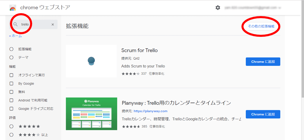 検索窓にアプリの名称や「トレロ」、「Trello」などと入力すると関連する拡張機能が表示されます。