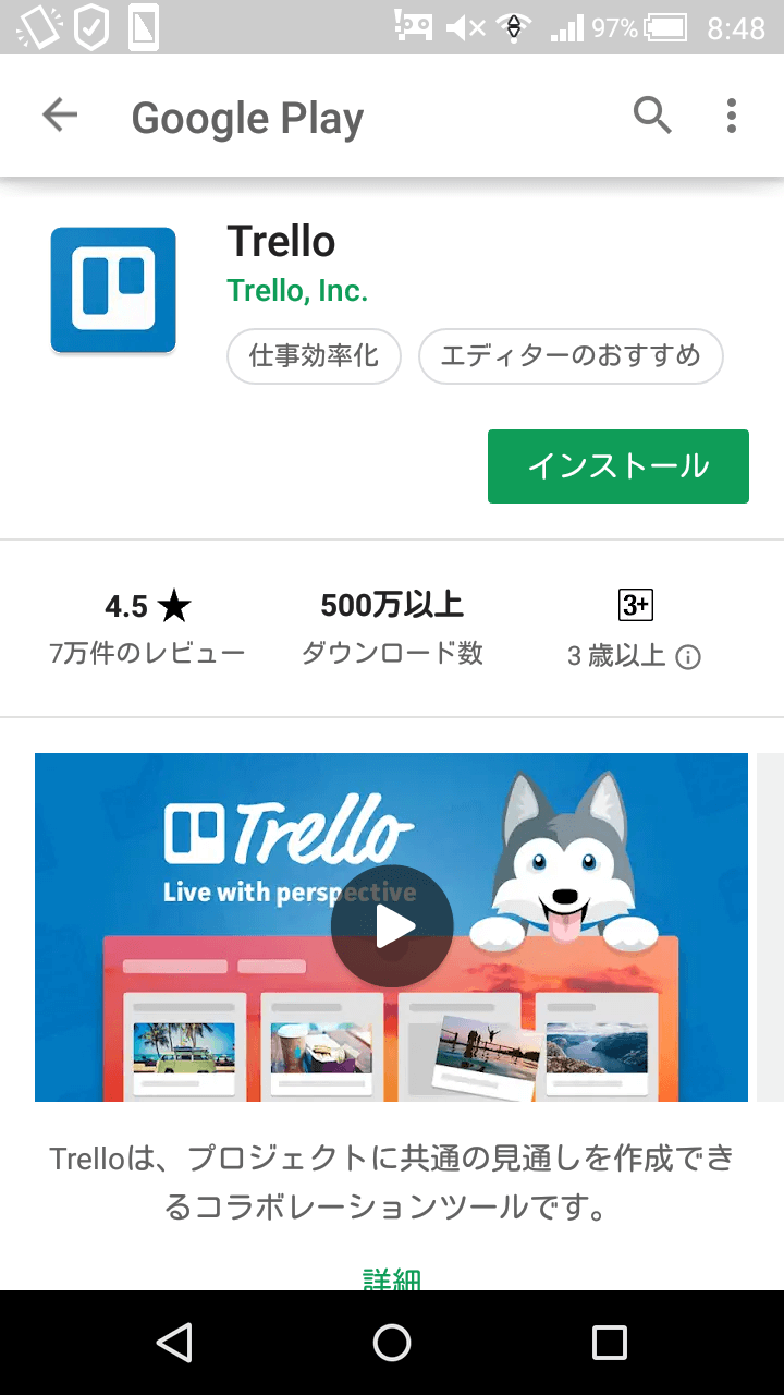 こちらがGooglePlayのトレロの画面。この画面からアンドロイド端末にトレロをインストールします。